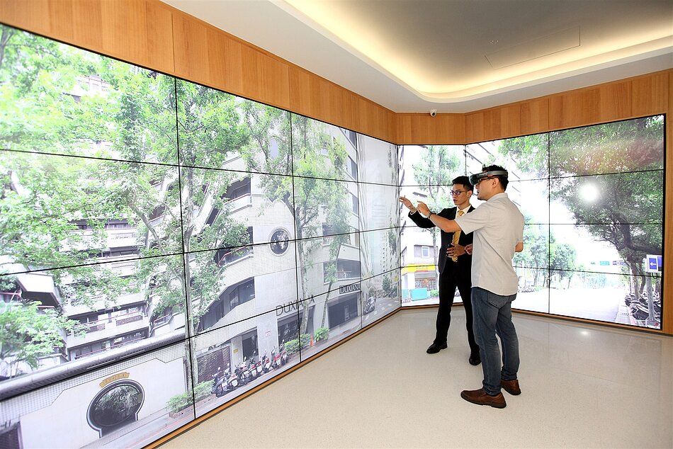 《i+智慧創新體驗館》主要分為三區域。一進門處的「i+智慧-智能生活」:運用最新混合實境(MR)技術,將生活圈搬到消費者眼前,提供消費者「買屋前,先體驗周邊生活圈」的身歷其境看屋服務模式,只需戴上MR眼鏡,信義區3D立體圖就在眼前展開,從空中鳥瞰,信義區重點商圈和著名地標,到物件周邊的市場、餐廳、交通設施等都在彈指間清晰掌握;再轉個身就能漫步在逸仙路巷弄生活圈,無論餐廳的評價或照片、捷運站公車資訊,甚至附近的成交行情,或知名的「翠亨村」待售物件,也都能在一指操控下映入眼簾。
